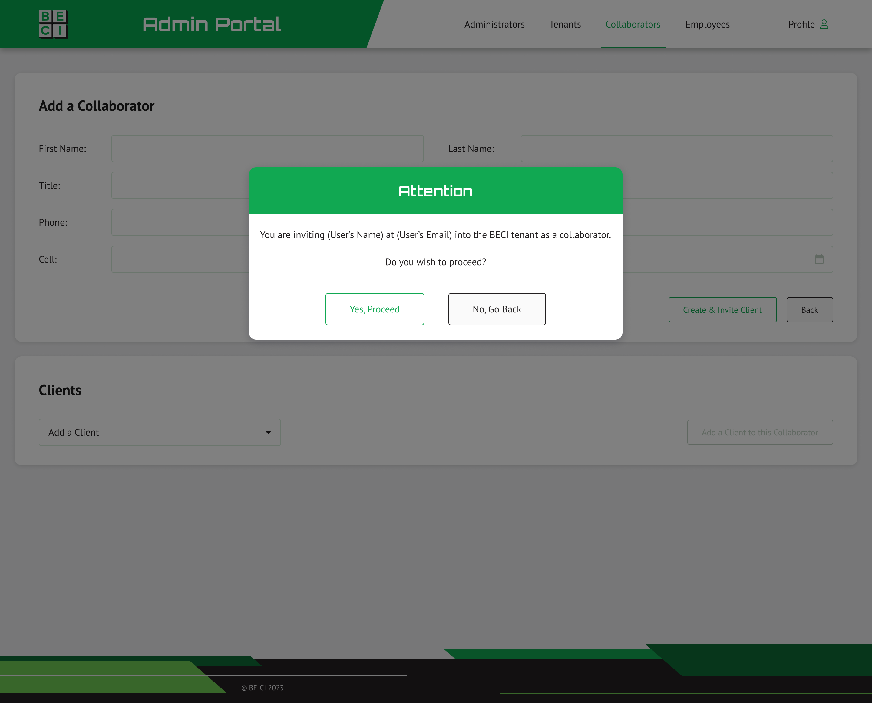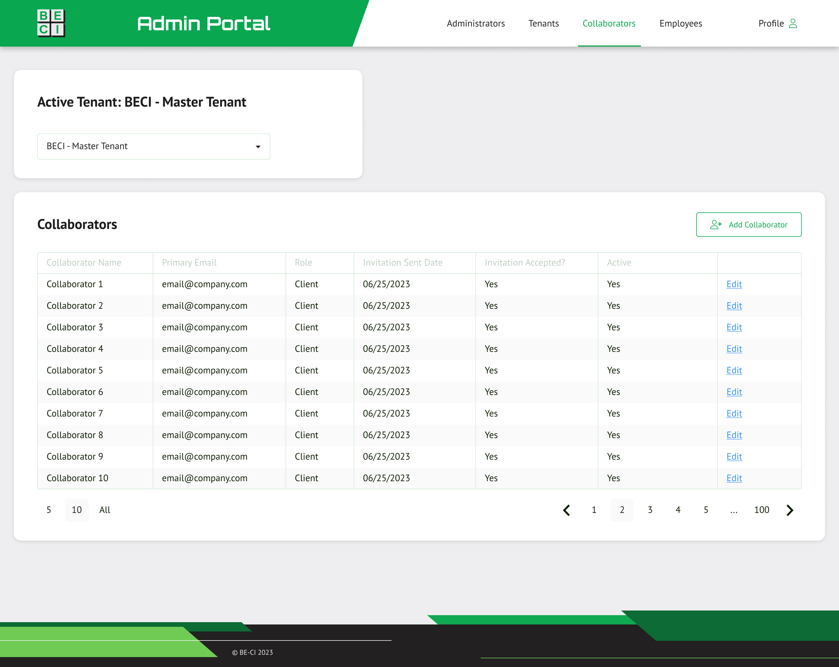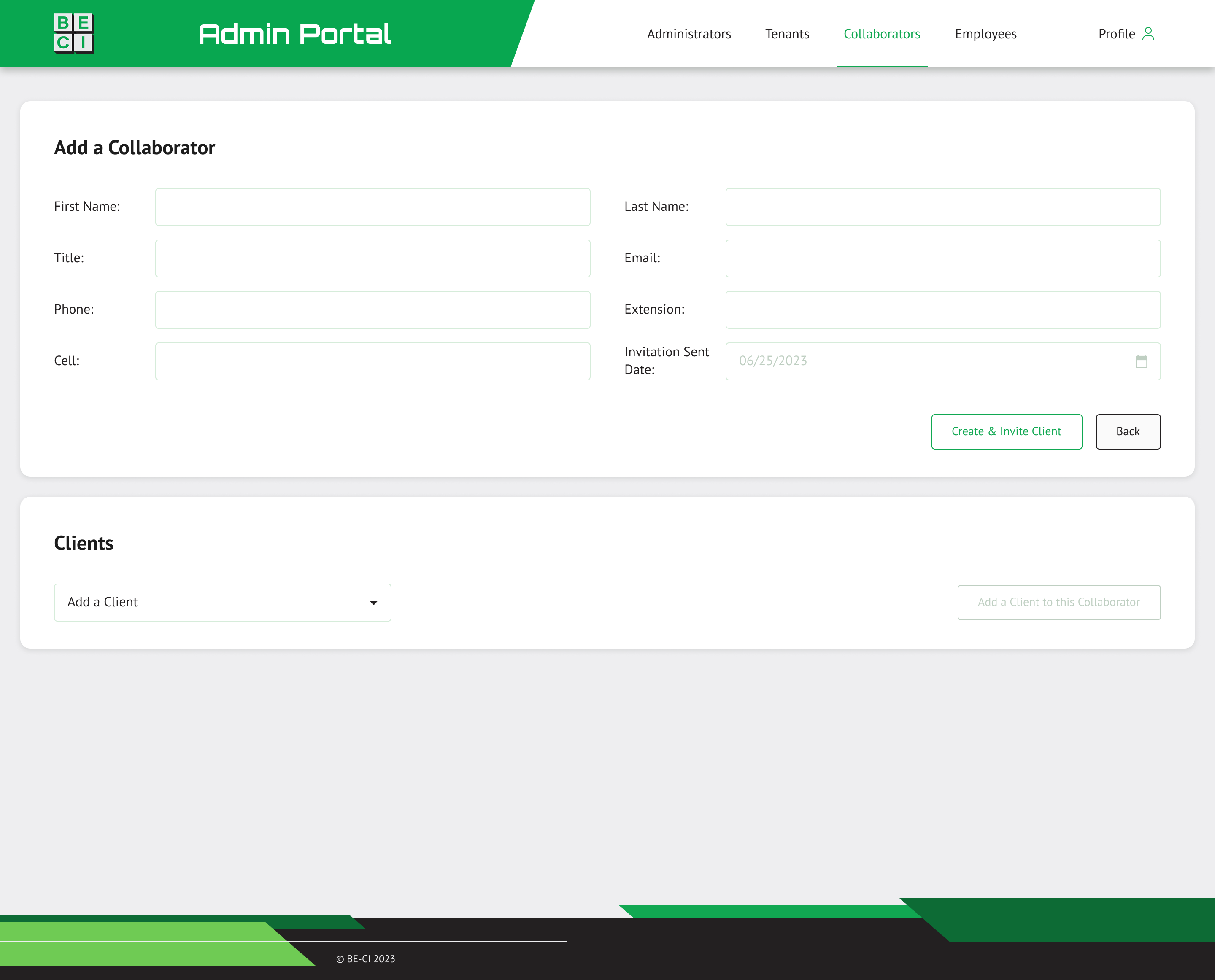 During this phase of the design, the BECI team decided to change “clients” to “collaborators.” This decision was made because the word clients is used in NSPEC as the client of a collaborating company. So in my designs, the companies that use NSPEC are now collaborators, and their customers are now clients.