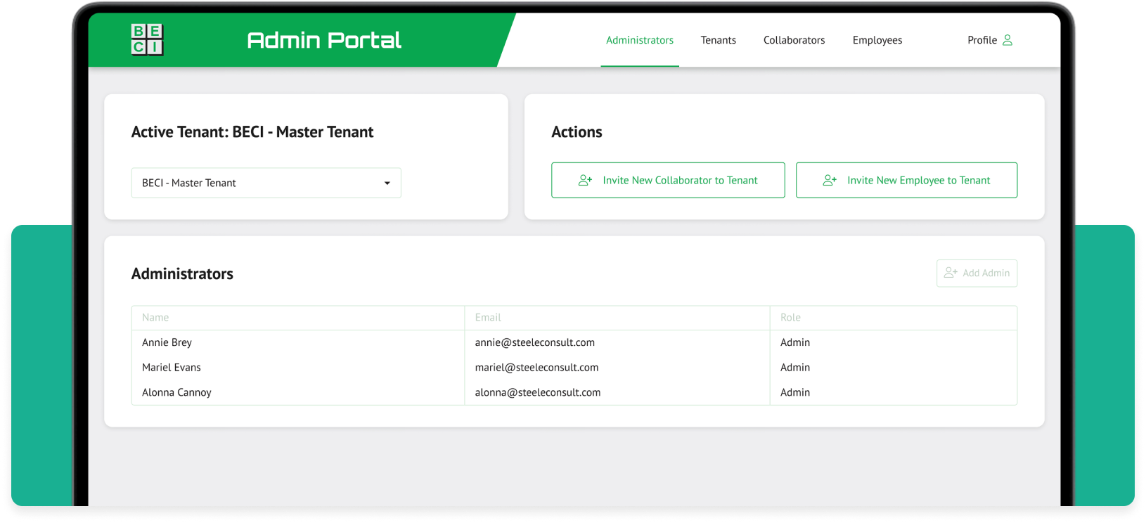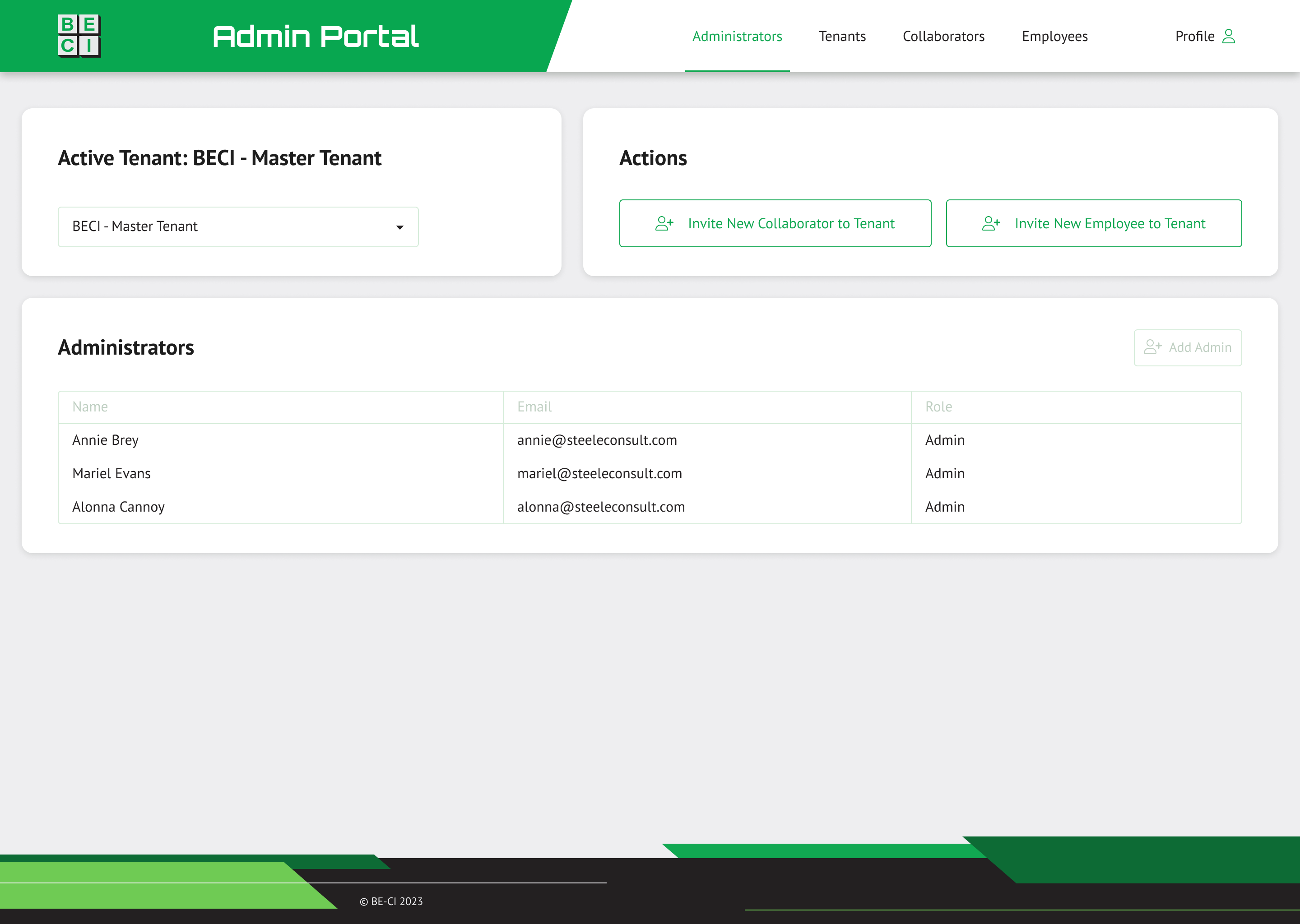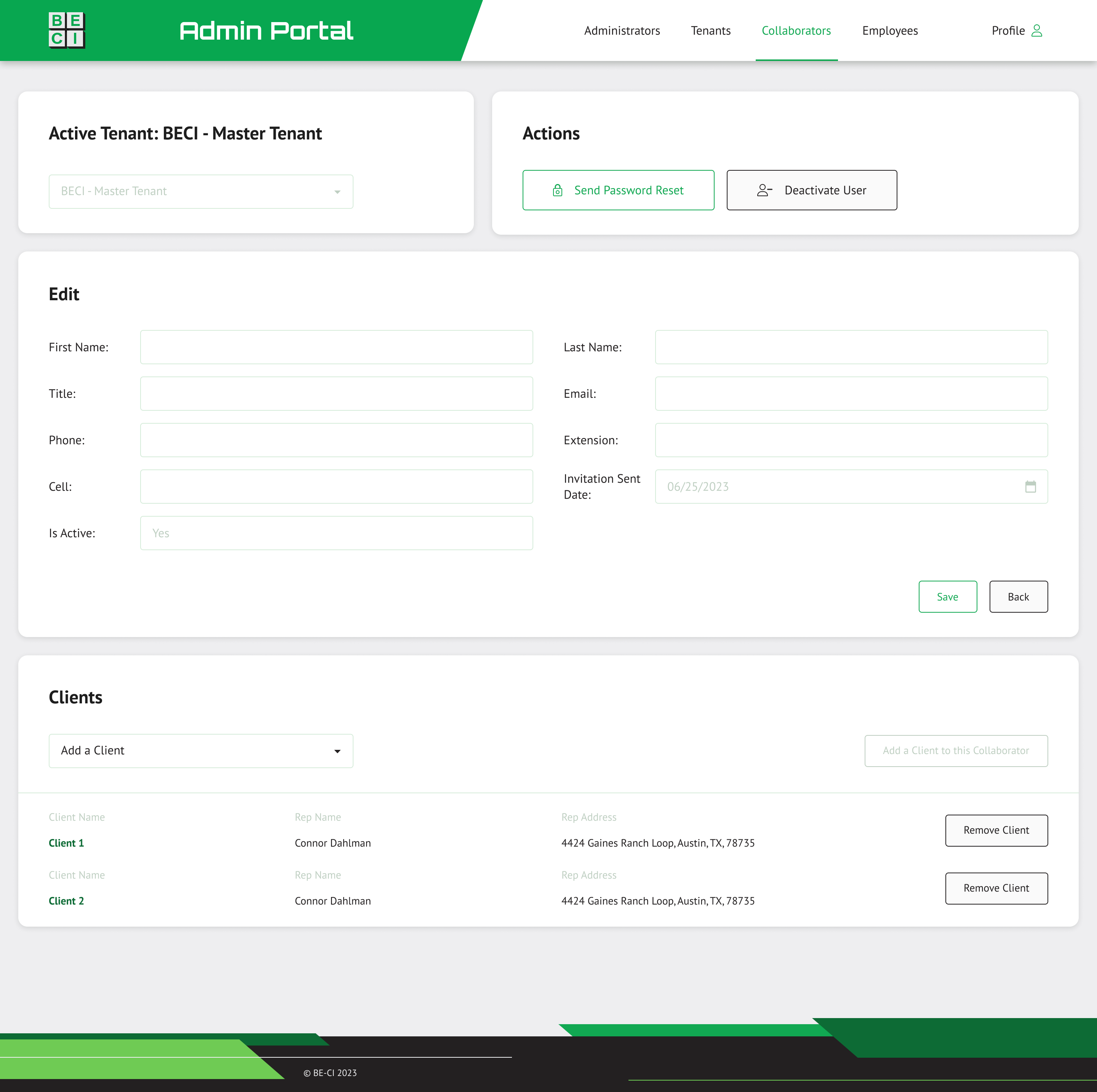 I designed a tool that allows BECI to manage client profiles. Both company and user profiles can be added to the system, they can have their passwords reset by the administrator, and they can be activated or deactivated with the click of a button.
