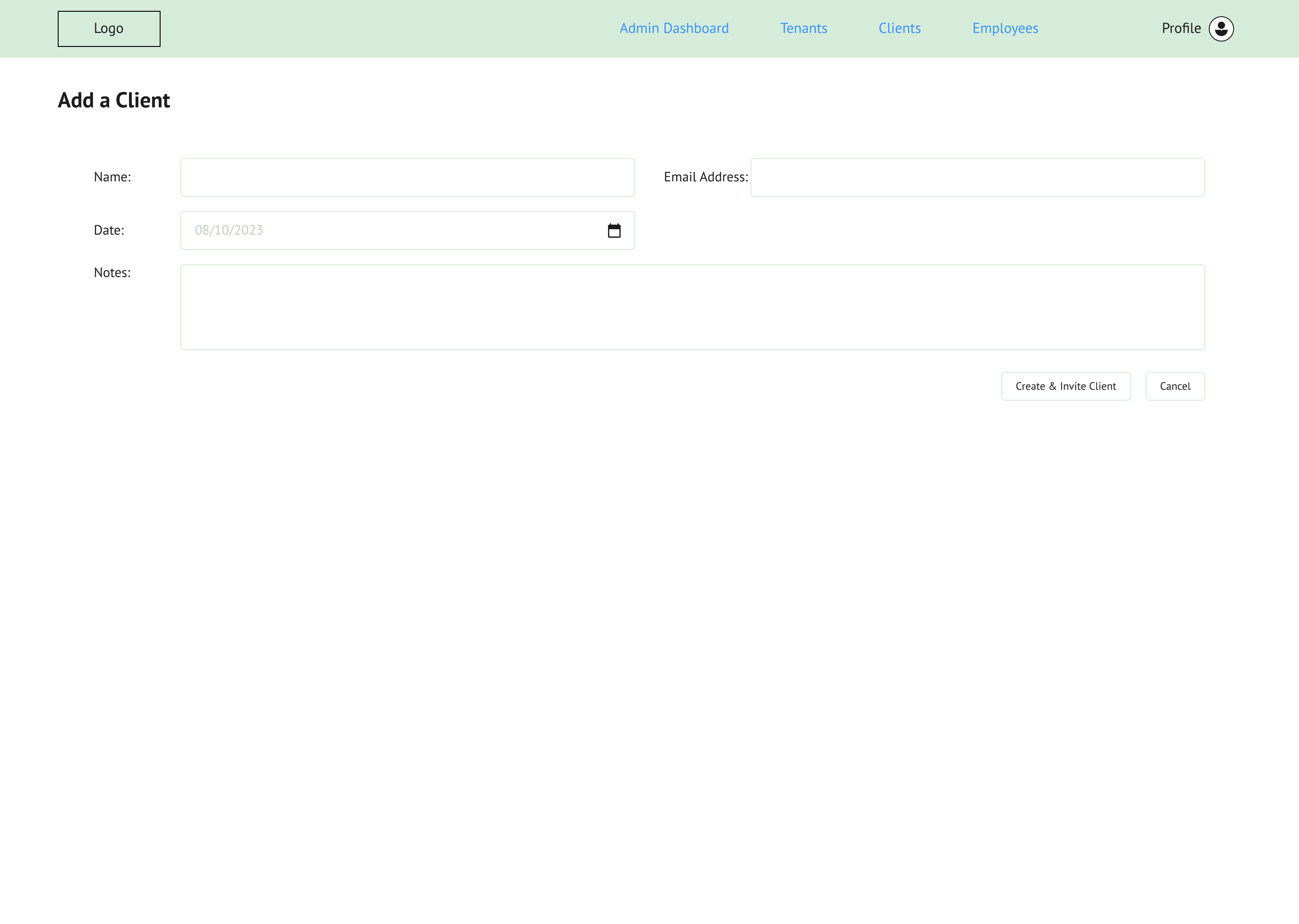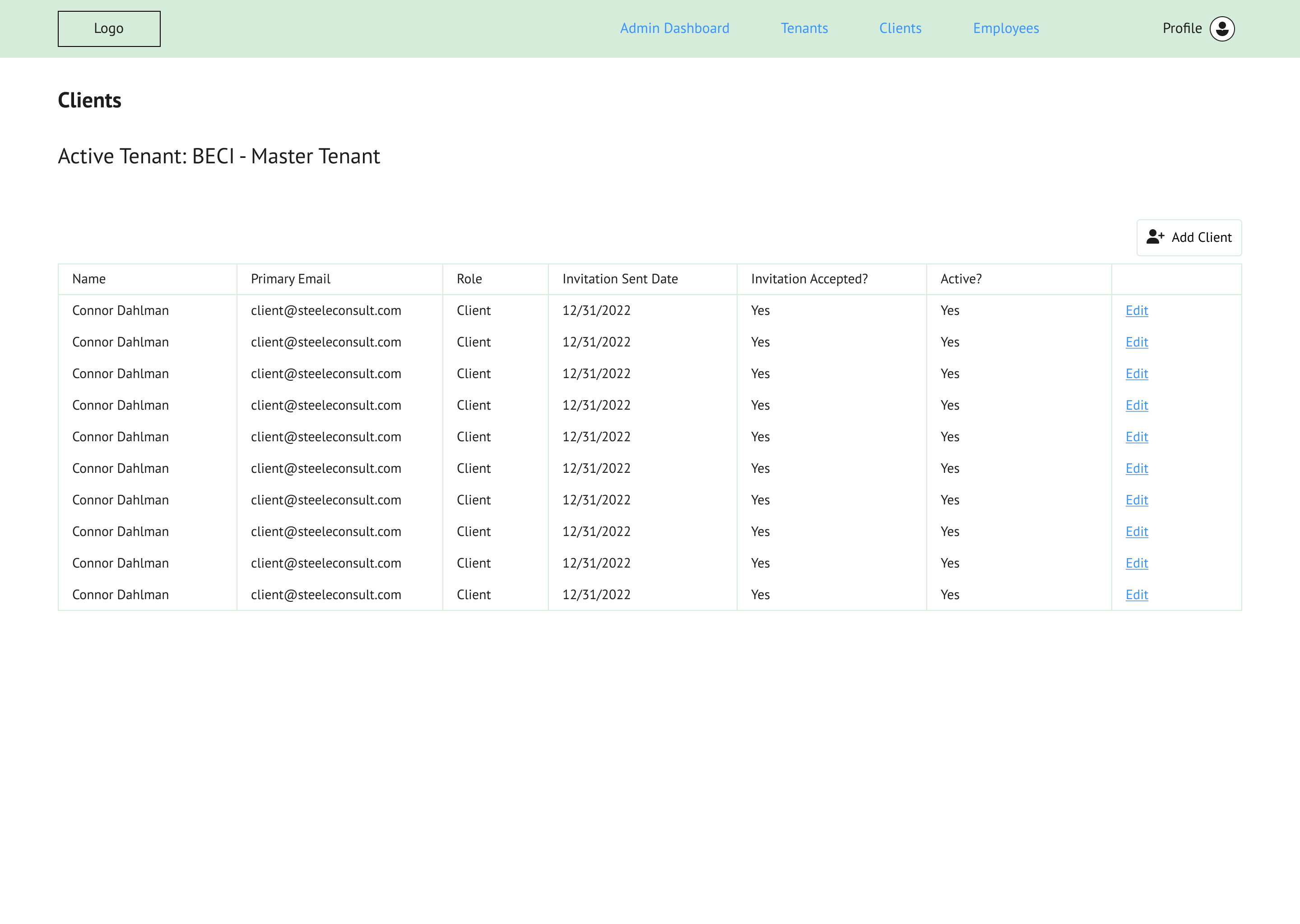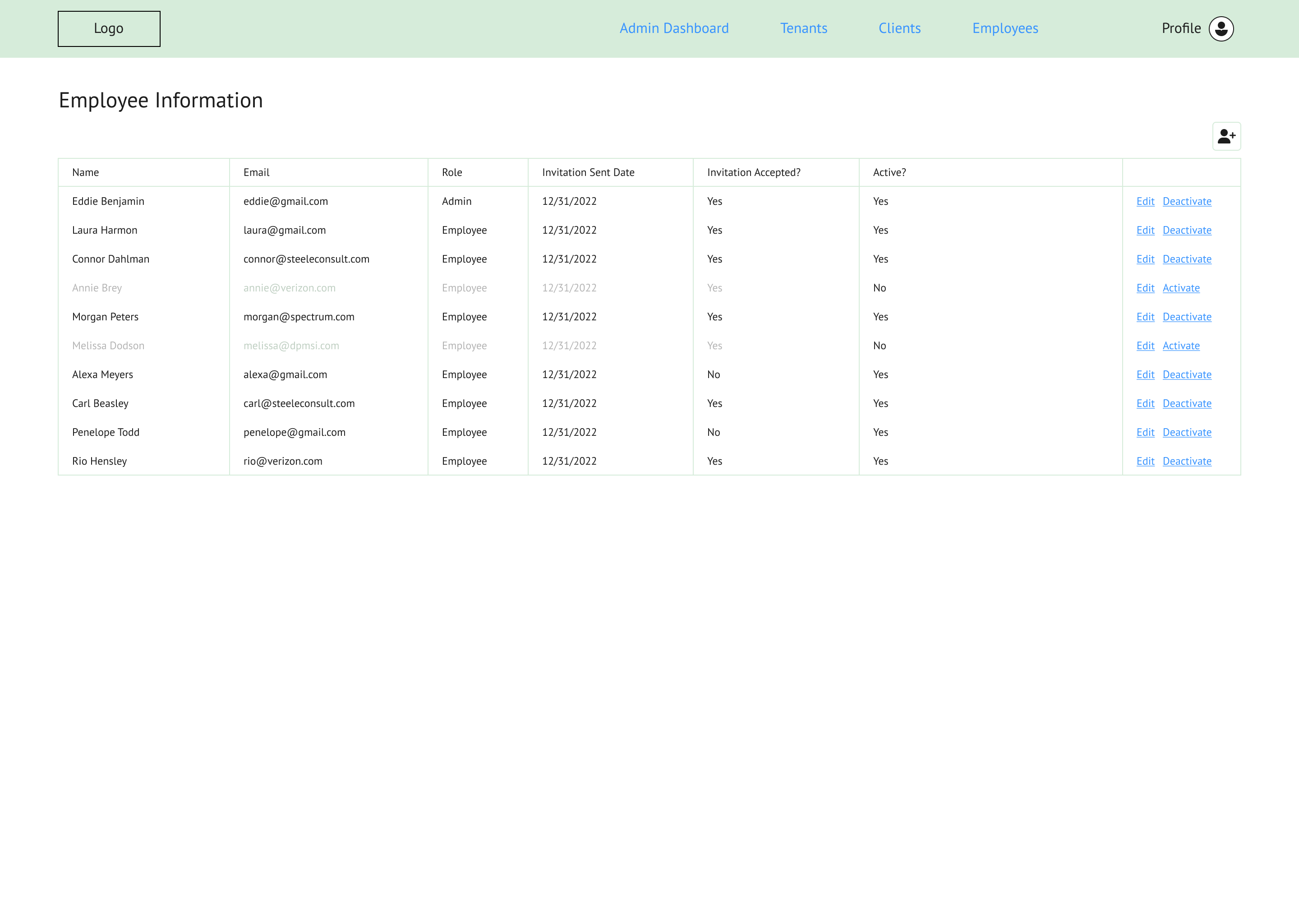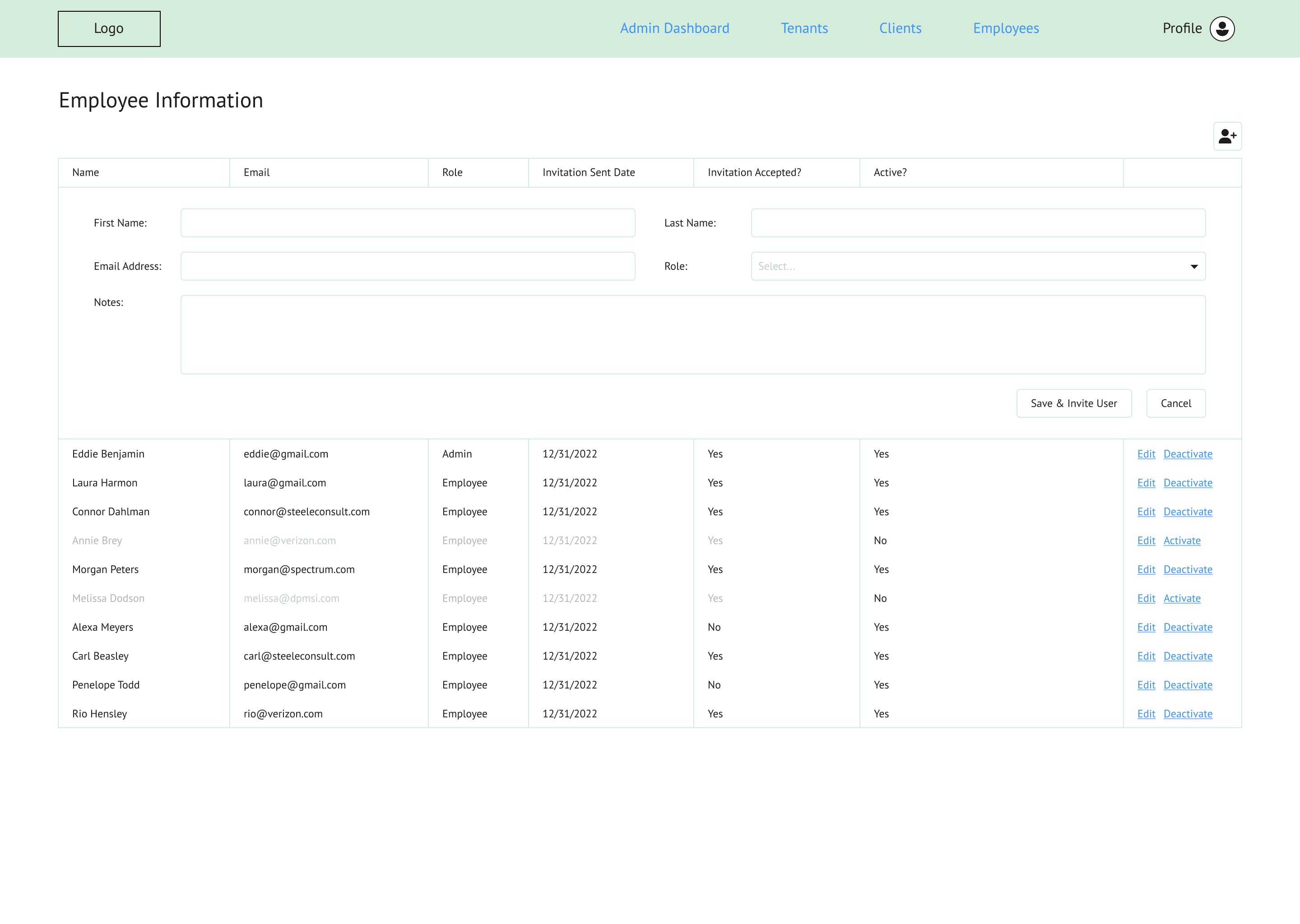 Each page, Tenants, Clients, and Employees, would have a simple table. Users could be activated or deactivated, and each user’s information could be edited with an inline form. New users could be added by clicking the button at the top right of the table.