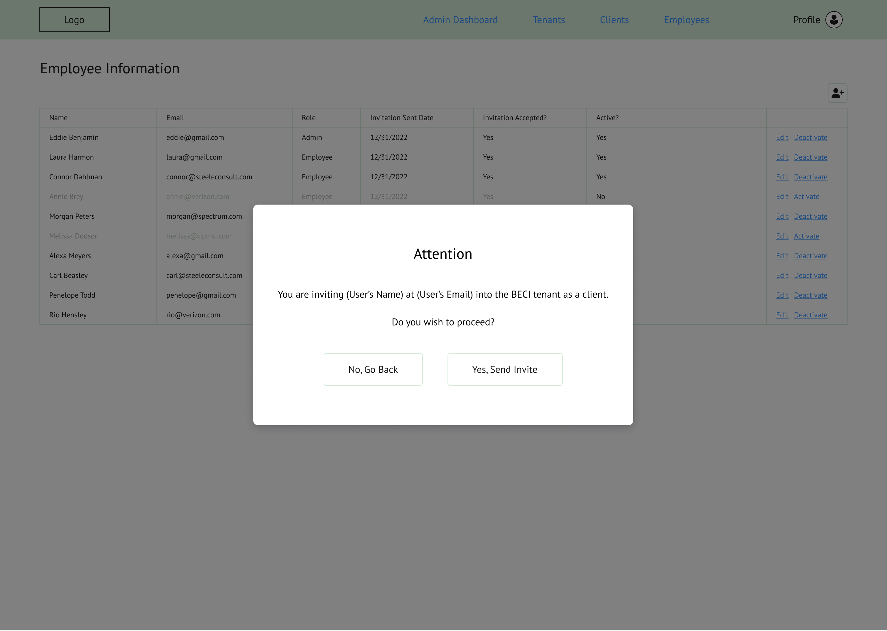 The third change is the addition of the admin grid. These admins are the people that will be using this system. They are the ones who invite new clients and employees to NSPEC. Admins cannot be added or edited from here, that can only be done on the backend, but BECI wanted the ability to change that in the future, so I added a button that can do that, it’s just disabled for now.